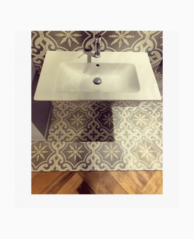 Una collezione effetto cementine duetta con il legno all'interno del bagno padronale.
