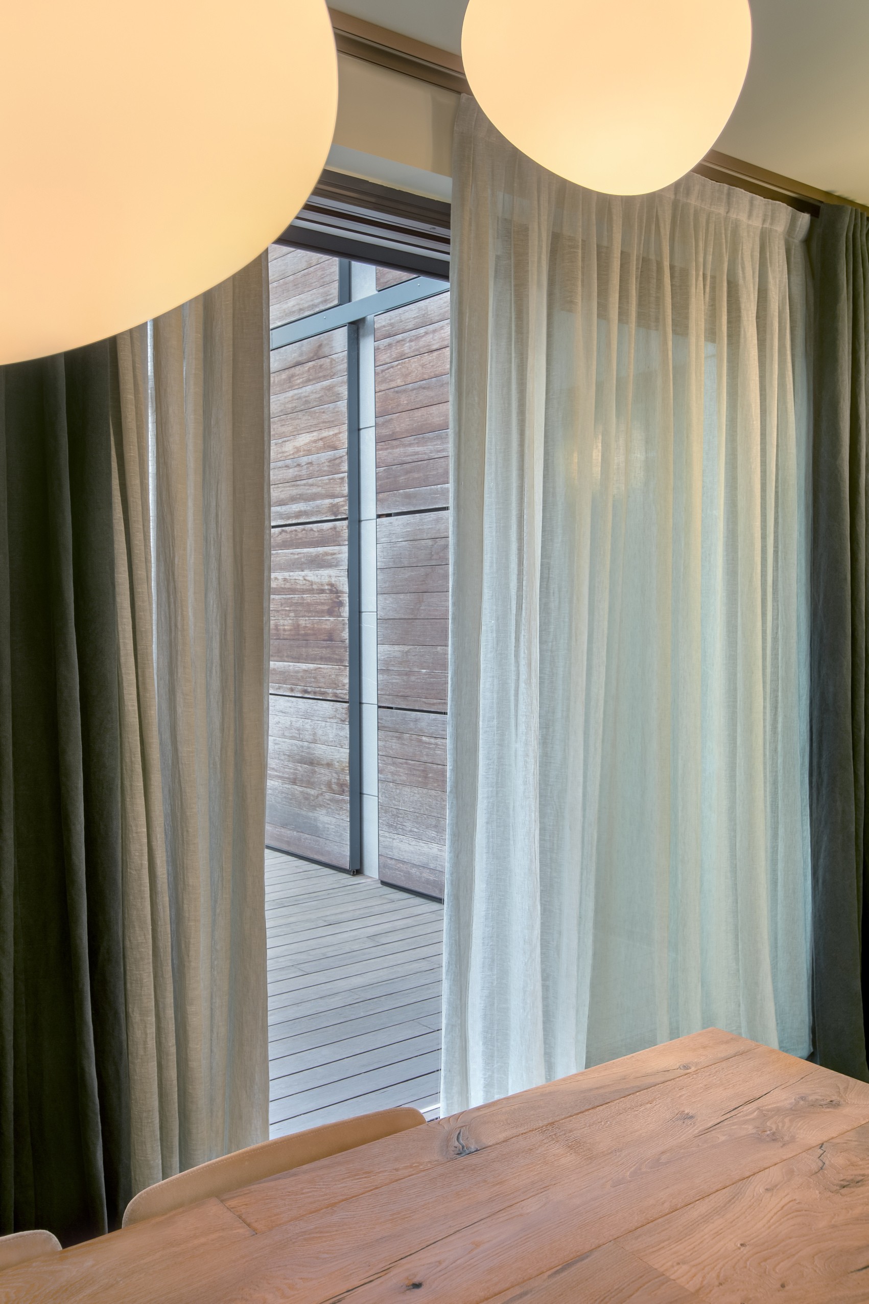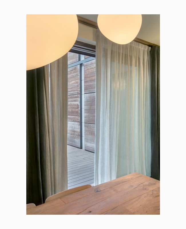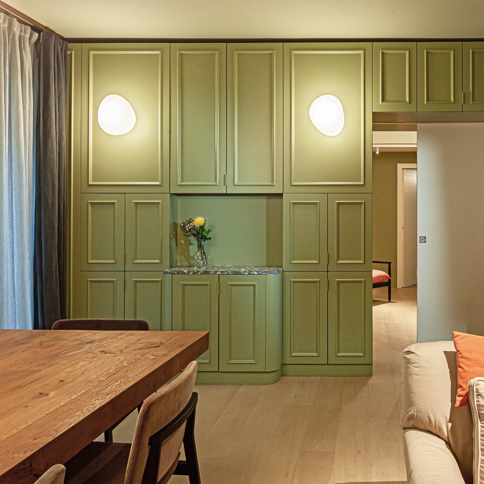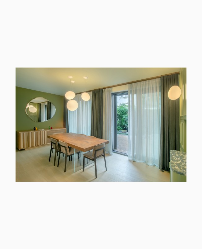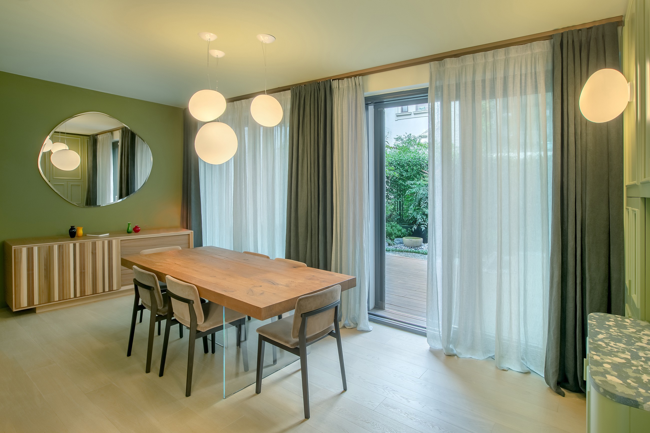 La parete della zona giorno ospita un angolo bar con giochi di luce e un giallo senape fa da sfondo alla parete tv; nella zona pranzo predomina il colore verde giocato su due toni, malva e bosco, un grande tavolo in legno di quercia e grandi vetrate sul terrazzo su cui si riflettono le grandi bowl sospese a soffiitto...con un effetto suggestivo all'ora di cena...le tende doppie, di due tessuti differenti, uno più leggero e trasparente, che lascia intravedere il giardino e l'altro pesante per godersi l'effetto home theatre, garantiscono due diversi livelli di privacy. I mobili contenitivi sono stati progettati per la maggior parte "custom", al fine di sfruttare al centimetro lo spazio e con un buon risultato estetico, armonioso nei colori e nelle finiture ; tutto il necessario viene nascosto per mantenere ordine e pulizia. Anche nella cucina , nella lavanderia, nello studio e nella zona notte... la progettazione di armadi su misura ci ha permesso di giocare con le tonalità di colore desiderate e rendere gli ambienti sobri, utilizzando materiali di qualità.