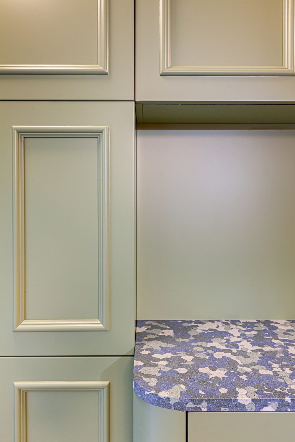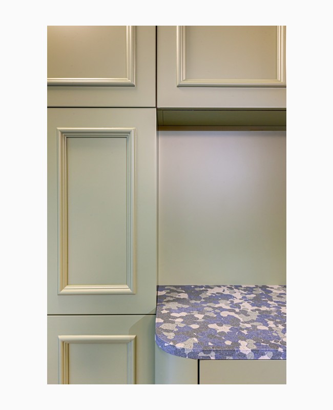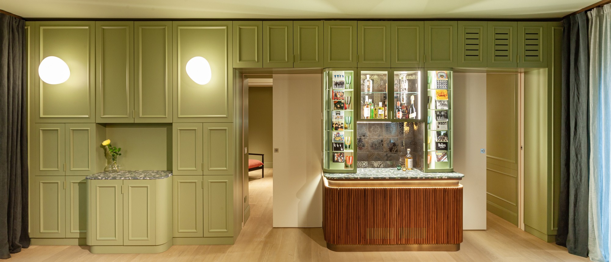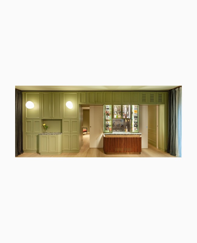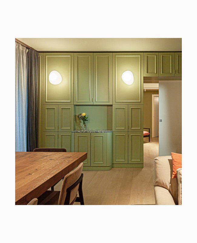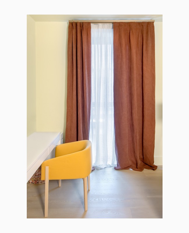 La parete della zona giorno ospita un angolo bar con giochi di luce e un giallo senape fa da sfondo alla parete tv; nella zona pranzo predomina il colore verde giocato su due toni, malva e bosco, un grande tavolo in legno di quercia e grandi vetrate sul terrazzo su cui si riflettono le grandi bowl sospese a soffiitto...con un effetto suggestivo all'ora di cena...le tende doppie, di due tessuti differenti, uno più leggero e trasparente, che lascia intravedere il giardino e l'altro pesante per godersi l'effetto home theatre, garantiscono due diversi livelli di privacy. I mobili contenitivi sono stati progettati per la maggior parte "custom", al fine di sfruttare al centimetro lo spazio e con un buon risultato estetico, armonioso nei colori e nelle finiture ; tutto il necessario viene nascosto per mantenere ordine e pulizia. Anche nella cucina , nella lavanderia, nello studio e nella zona notte... la progettazione di armadi su misura ci ha permesso di giocare con le tonalità di colore desiderate e rendere gli ambienti sobri, utilizzando materiali di qualità.