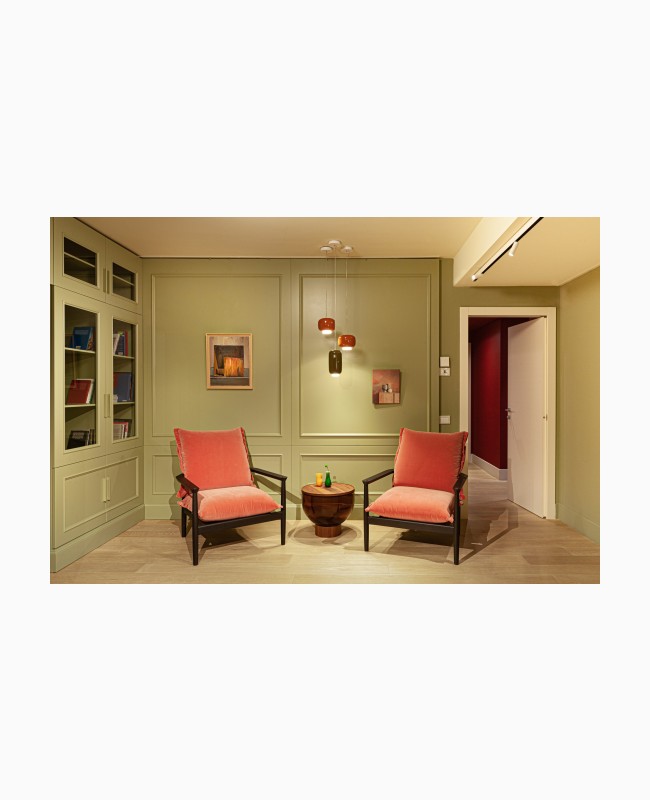 Un ampio ingresso con salottino , un colorato guardaroba di ingresso e un'alta libreria con ante in vetro; attraverso la libreria, che presenta due aperture si accede alla zona giorno e alla zona pranzo.